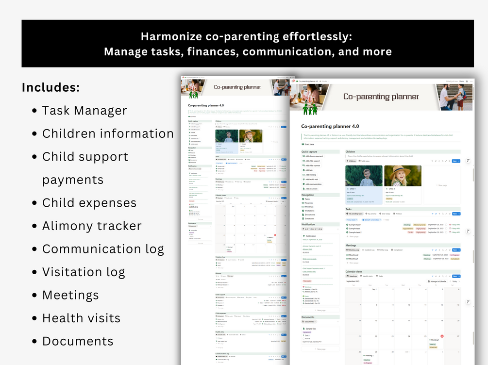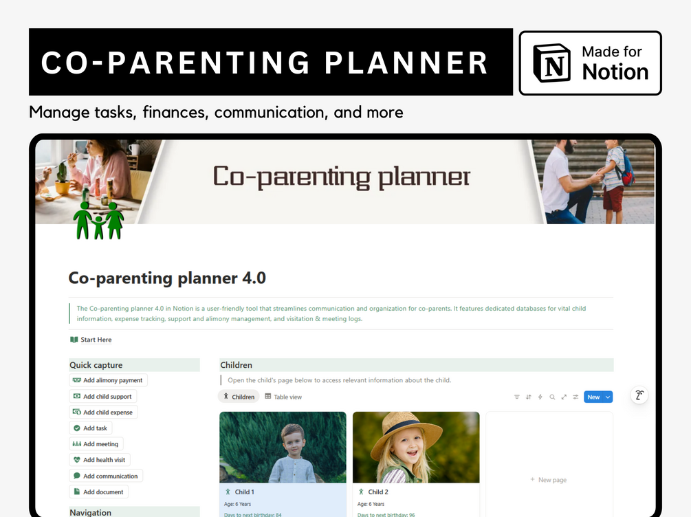The Co-Parenting Planner is your all-in-one Notion template for managing shared parenting responsibilities with ease. Keep child information, schedules, finances, and important documents in one organized space—reducing conflict and saving time.