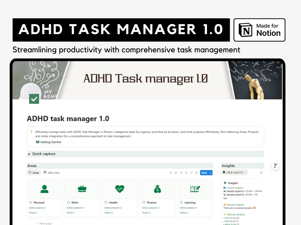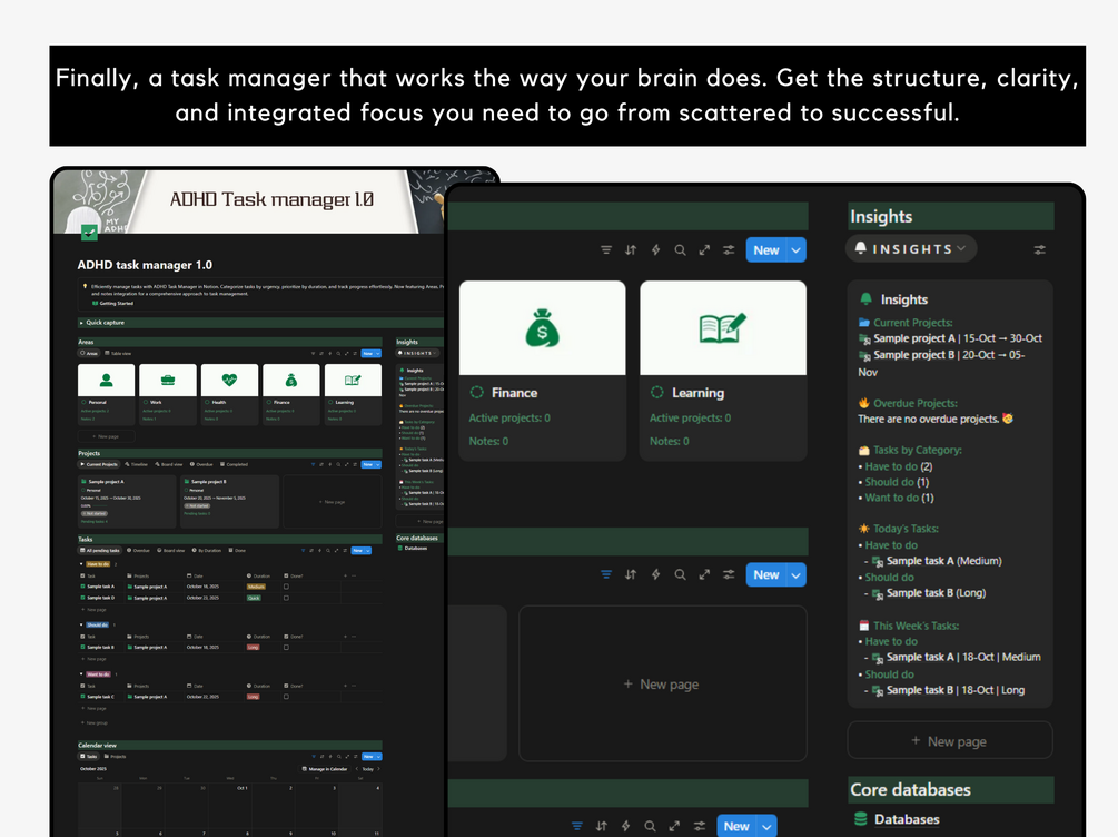 Designed specifically for the neurodivergent brain, the ADHD Task Manager 1.0 is a comprehensive Notion template that provides the clarity, structure, and organization you need to manage your life without the overwhelm. It helps you visualize your priorities, break down goals into manageable steps, and build focus through a system that works with your brain—not against it.