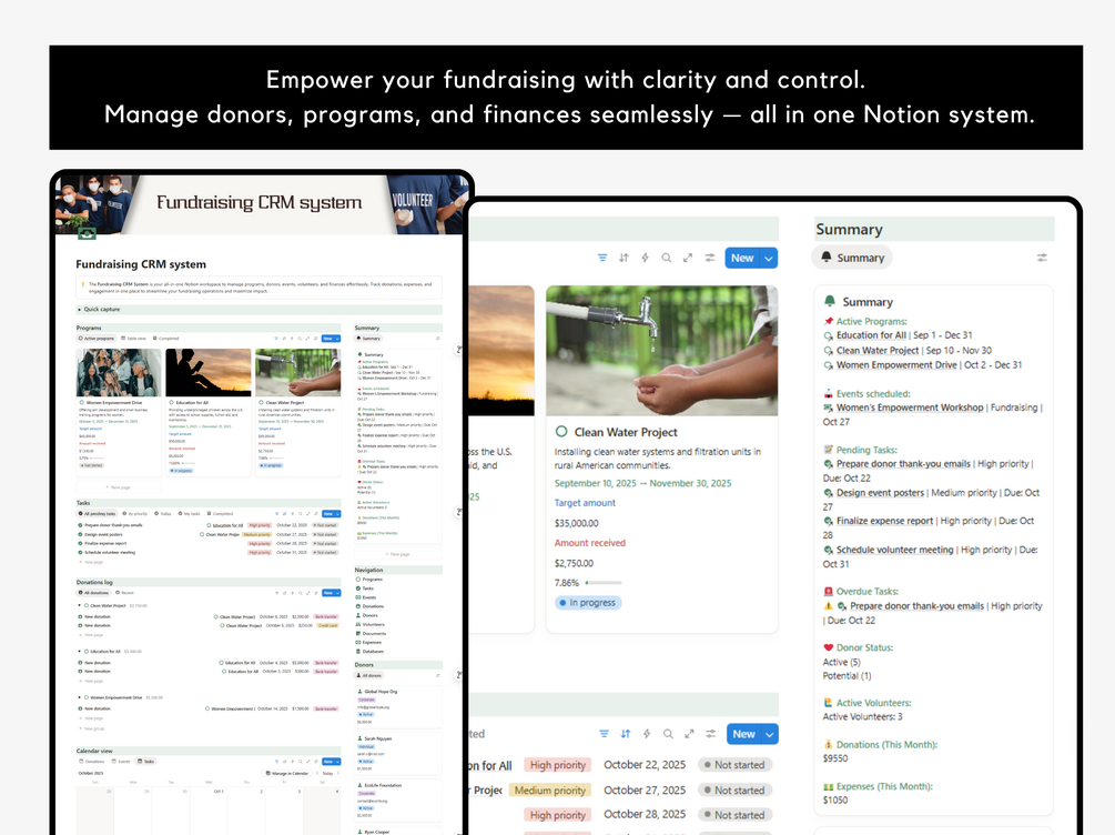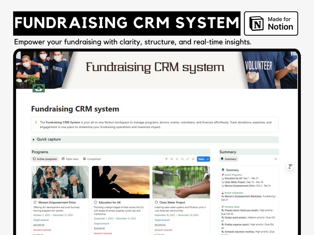 The Fundraising CRM System is a complete Notion solution designed to simplify how you manage donations, programs, events, and supporters. It brings together all your fundraising data in one unified system so you can focus more on impact and less on admin.