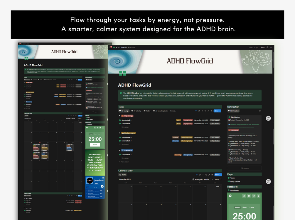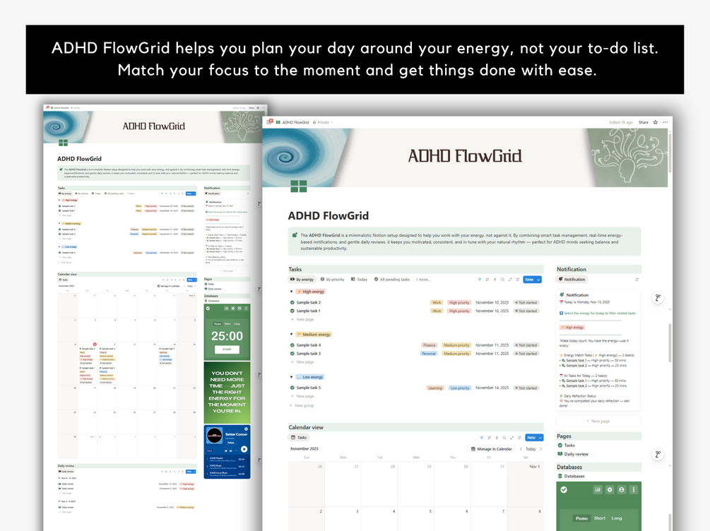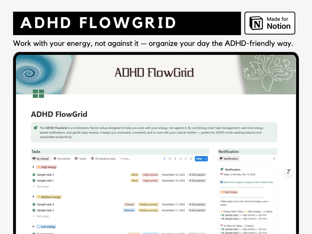 To close the loop, a gentle Daily Review helps you check in — not to judge what didn’t get done, but to reflect on what felt right, what drained you, and what supported your focus. Over time, you’ll spot patterns, find your best energy rhythms, and build consistency naturally. ADHD FlowGrid isn’t another system demanding perfection — it’s your compassionate structure, designed to turn chaos into clarity and help you find flow, one day at a time.