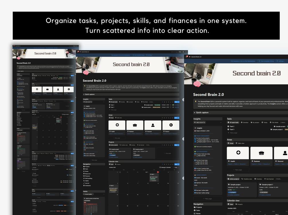 Feeling overwhelmed by scattered notes, tasks, and information? The Second Brain 2.0 Notion Template is your all-in-one system to organize projects, build skills, manage finances, and track habits—so you can stay focused, productive, and in control.