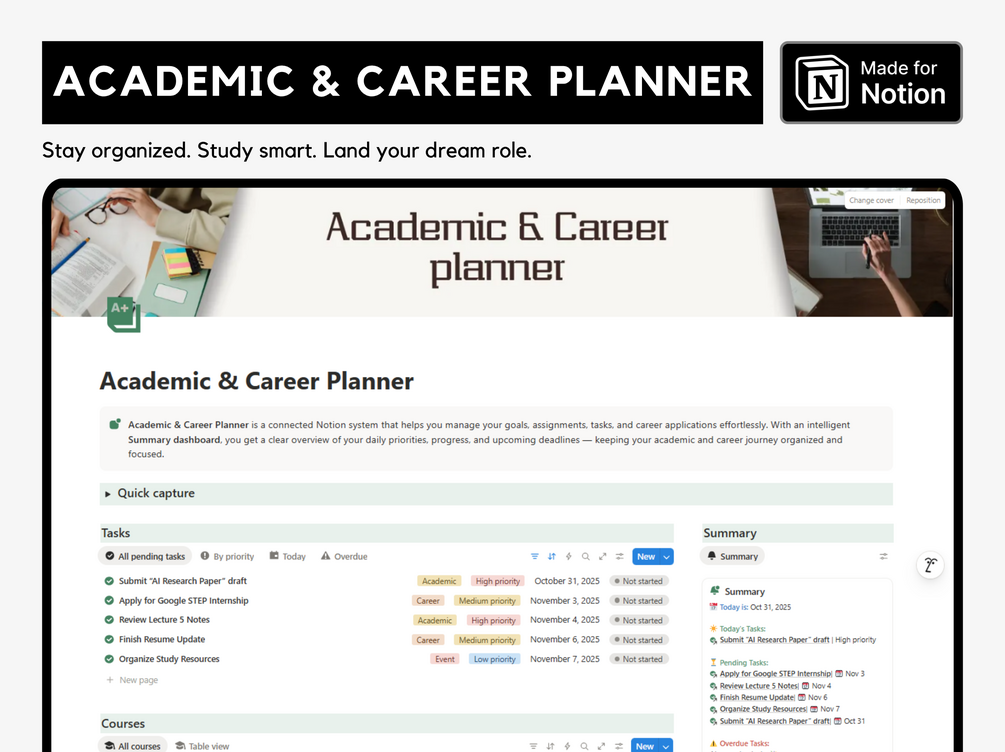 Meet the Academic & Career Planner — your ultimate Notion workspace to streamline your studies and career journey in one powerful system. ✨