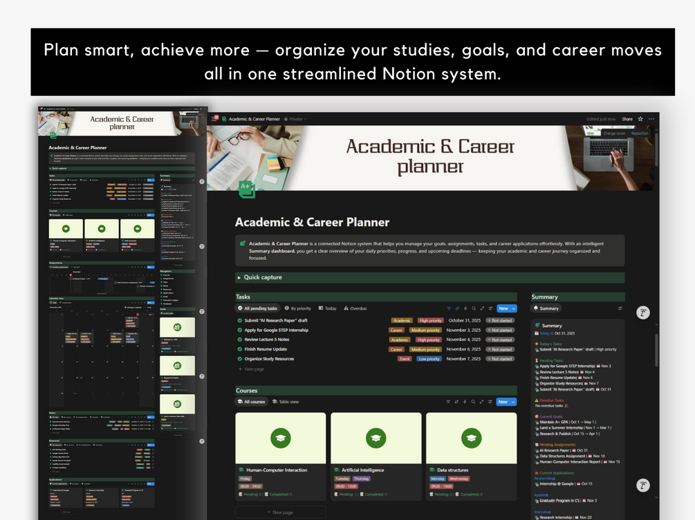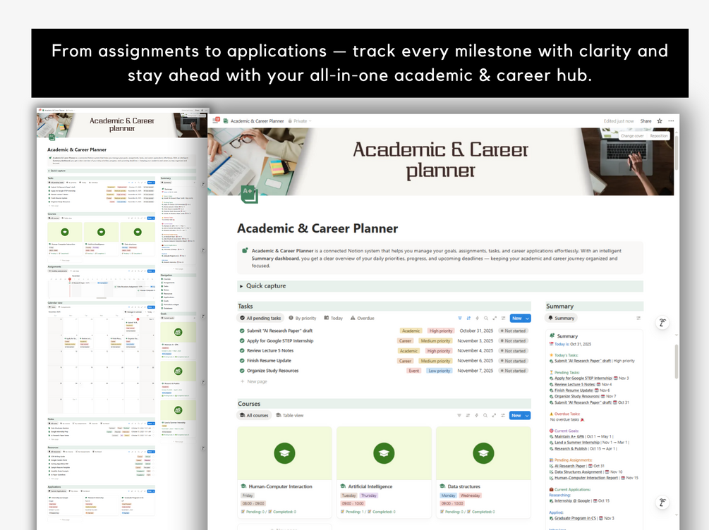 Meet the Academic & Career Planner — your ultimate Notion workspace to streamline your studies and career journey in one powerful system. ✨