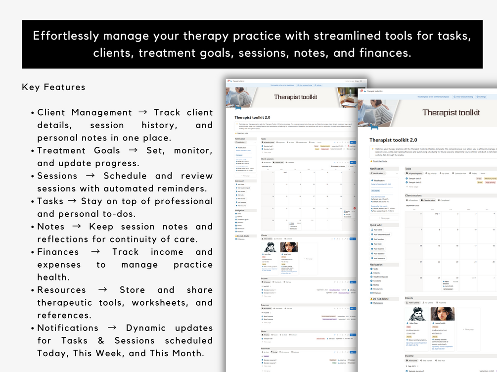 Whether you’re managing a large caseload or just starting your practice, the Therapist Toolkit Notion Template simplifies the administrative side of therapy, giving you more time to focus on what matters most—helping your clients.