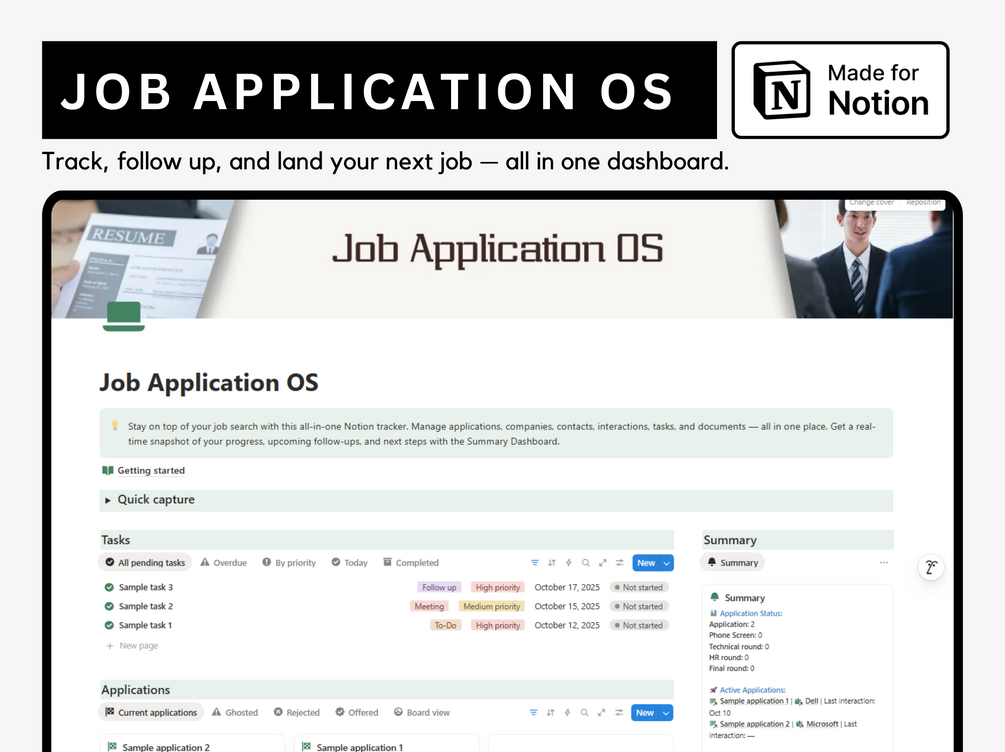 Searching for a job can quickly become overwhelming — keeping track of multiple applications, deadlines, communications, and follow-ups across LinkedIn, company portals, and emails is exhausting. Job Application Tracker OS is a comprehensive Notion template designed to simplify your job hunt by centralizing everything in one organized system.
