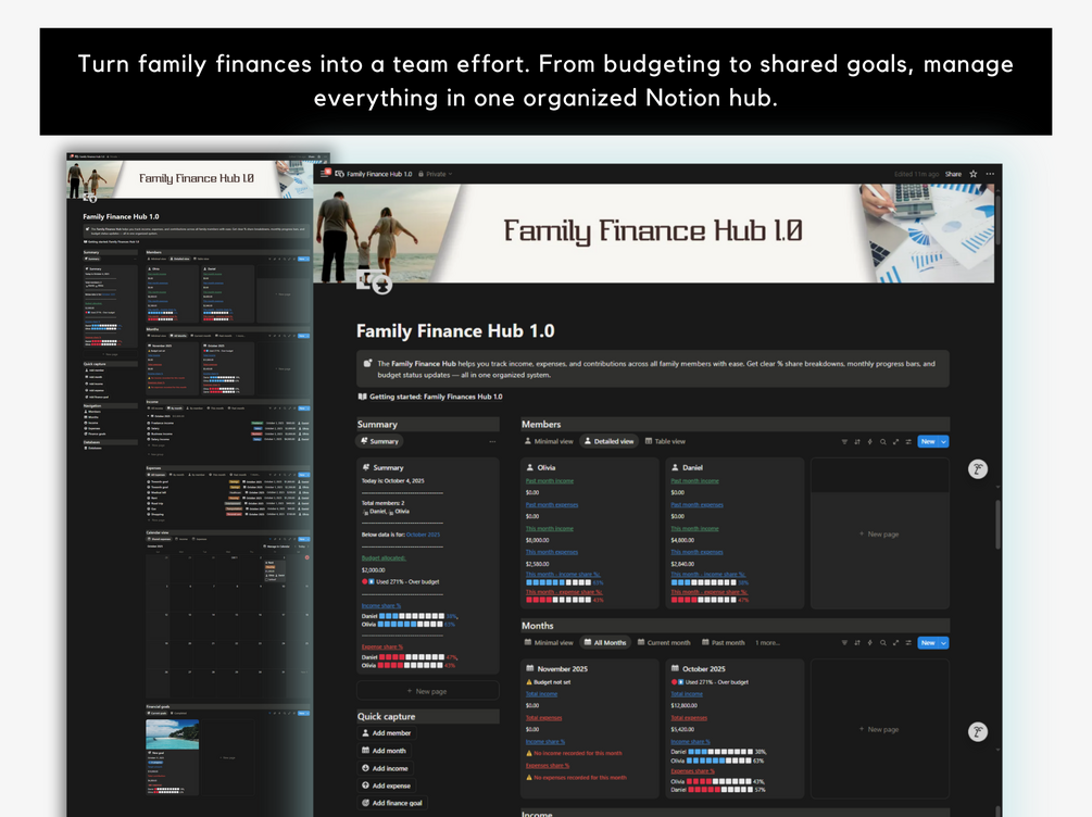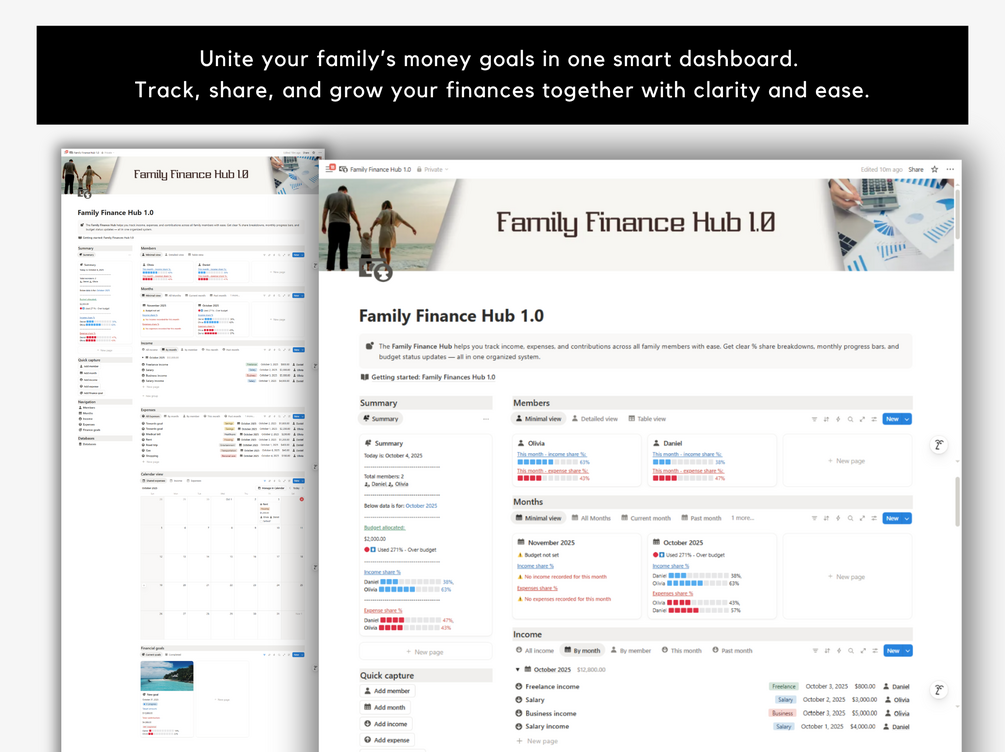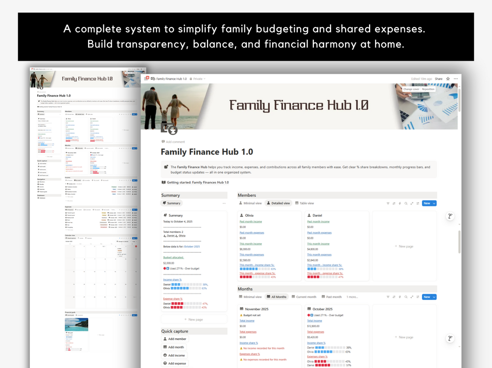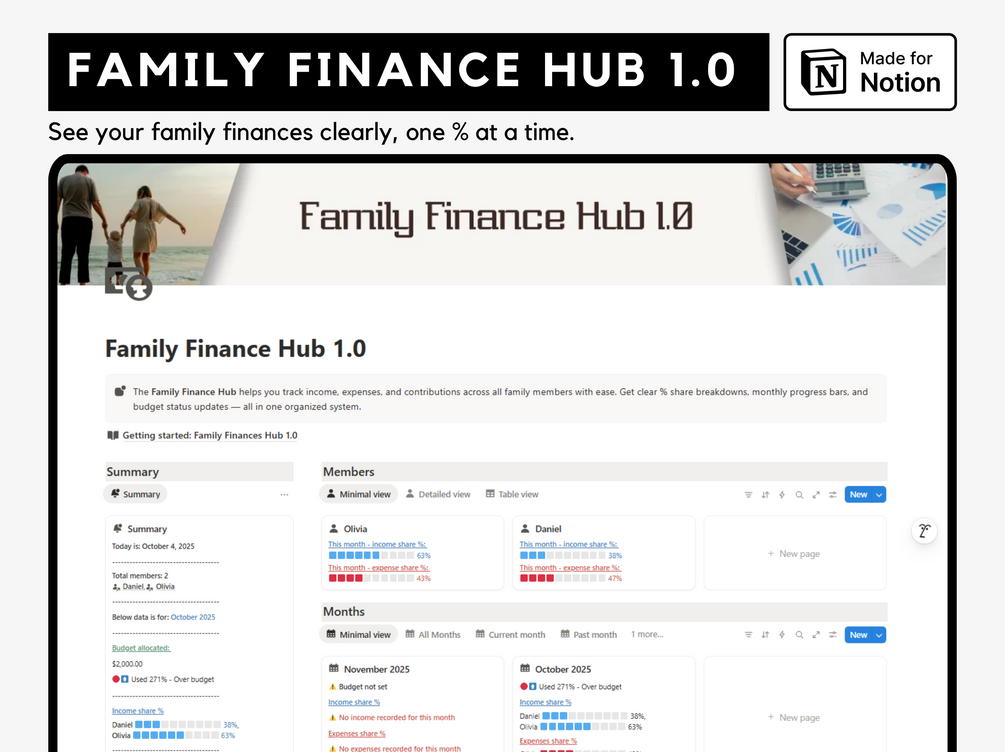 The Family Finances Hub 1.0 is a complete Notion system designed to help families or shared households manage money collaboratively. From tracking income and expenses to setting shared financial goals, this hub ensures every rupee (or dollar) is accounted for — transparently and efficiently.