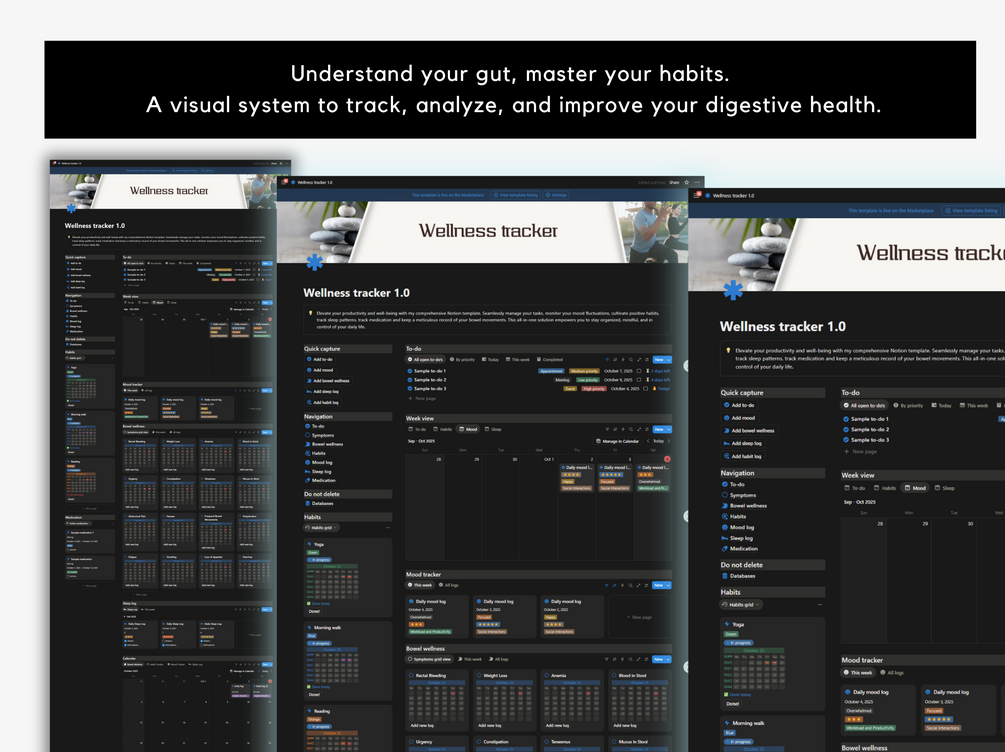 Take control of your digestive health with the all-in-one Wellness Tracker Notion template. This comprehensive hub helps you uncover the connection between your daily habits, lifestyle choices, and gastrointestinal well-being — giving you data-driven insights to improve your gut health naturally.